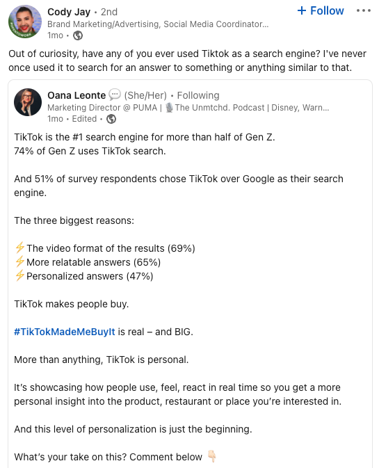 But as I rolled through the comments in the post, I quickly realized that many out there don't understand the power of TikTok's search engine capabilities.